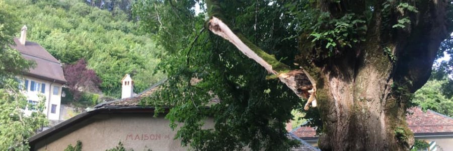 La nouvelle éclate brusquement sur les groupes WhatsApp de Romainmôtier ce dimanche, vers sept heures du soir. Puis viennent des photos. Le bois fendu. Les feuilles, partout, sur la route. La branche qui est tombée est énorme, et o...