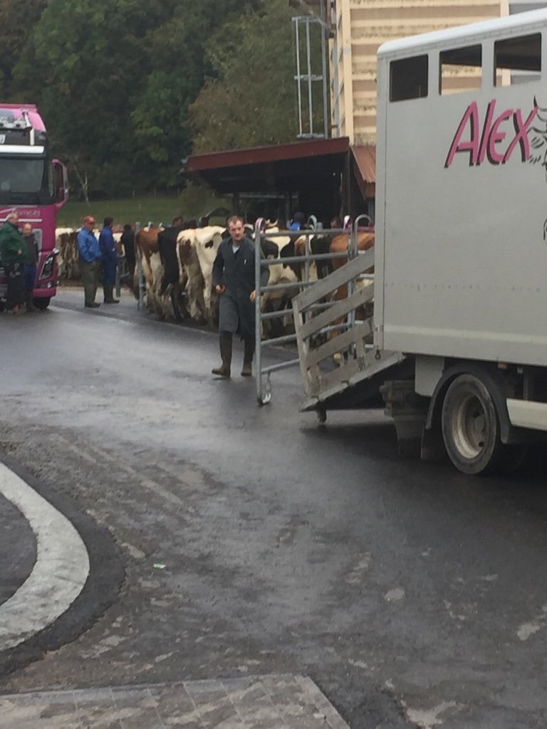 Les bêtes Bêtes à viande, bêtes à lait ? je ne sais pas. Elles sont de races variées, serrées les unes contre les autres dans de petits enclos temporaires, cernées de camion et d'hommes en tenue de toile bleue ou grise. Certaines sont marquées (à la peinture ? au feutre ?), elles sont stressées mais pas paniquées, elles n'ont pas cet air propre, solennel et calme des grandes brouteuses qu'on croise dans les champs et sur les alpages, lors des balades d'été. Elles sont crado, mal réveillées, secouées. Quand un accord est conclu, un type en toile bleue tire la bête avec une corde et la pousse dans le grand camion bétailler, Alex Desmeules, transport de bétail, tier transport.